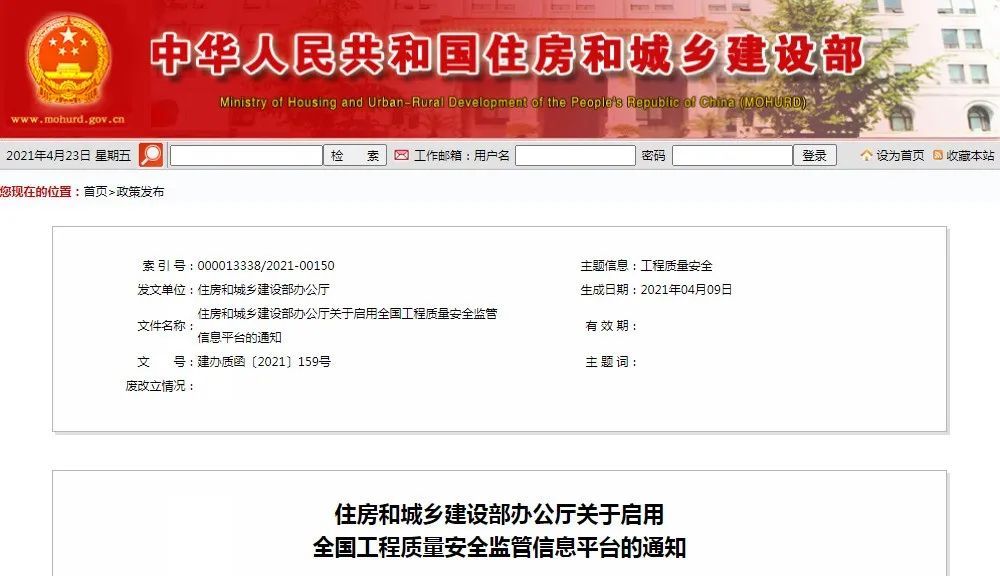 住建部:5月15日起,正式啟用全國工程質(zhì)量安全監(jiān)管信息平臺!